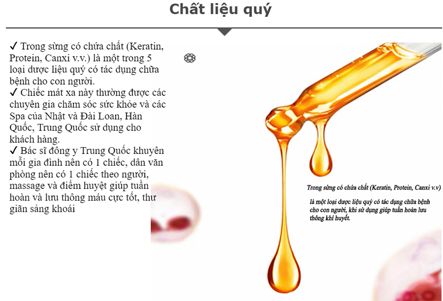 ✔ Trong sừng có chứa chất (Keratin, Protein, Canxi v.v) là một loại dược liệu quý có tác dụng chữa bệnh cho con người, khi sử dụng sẽ giúp tuần hoàn lưu thông khí huyết, phát tán chướng khí, không bị tĩnh điện.