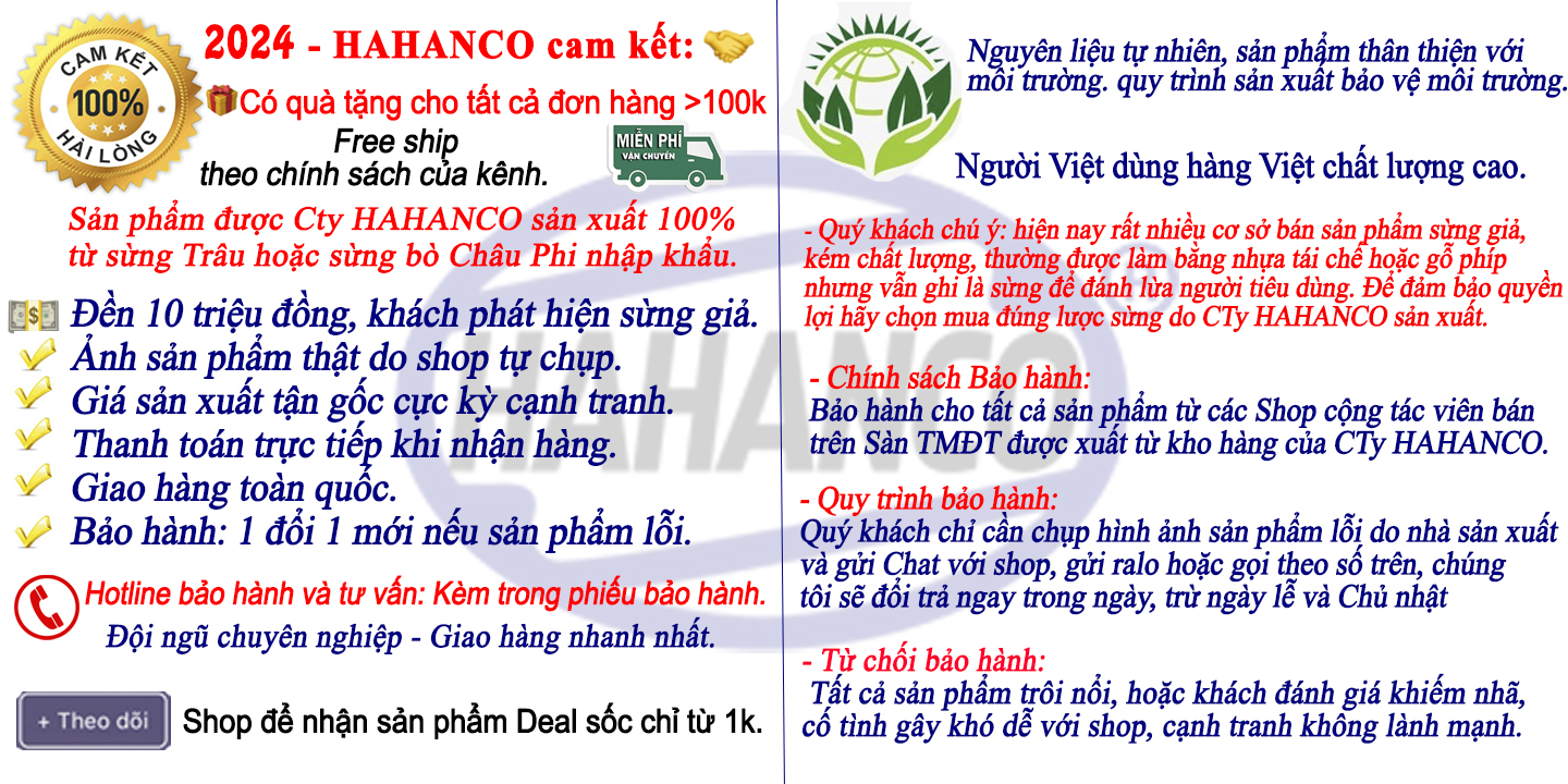 ❌ QUÝ KHÁCH CHÚ Ý: hiện nay rất nhiều cơ sở bán sản phẩm sừng giả, kém chất lượng, thường được làm bằng nhựa tái chế hoặc gỗ phíp nhưng vẫn ghi là sừng để đánh lừa người tiêu dùng. Để đảm bảo quyền lợi hãy chọn mua đúng sản phẩm sừng do CTy HAHANCO sản xuất ❌