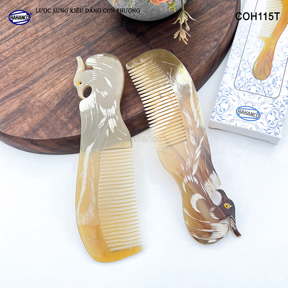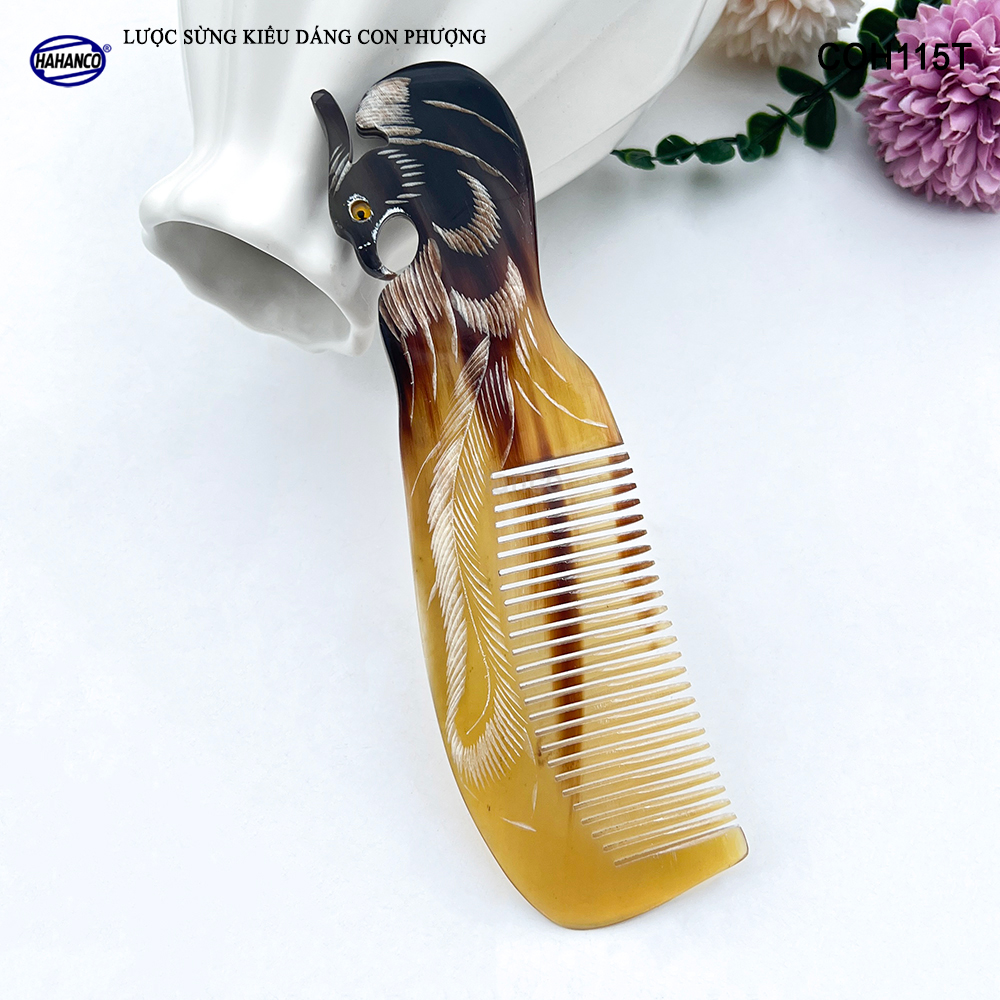 - Đây là mẫu lược sừng được các nghệ nhân làm thủ công tạo hình con Phượng. Mẫu lược này được sản xuất nhiều công đoạn phức tạp, các đường nét khía sâu vào thân lược rất tỉ mỉ và chi tiết, uốn lượn tinh xảo. Những chiếc răng lược được các bàn tay khéo léo mài dũa từng chiếc một cẩn thận để đạt được độ nhẵn bóng, khi chải tóc sẽ không làm gãy và rụng tóc.