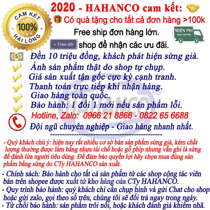 ❌ QUÝ KHÁCH CHÚ Ý: hiện nay rất nhiều cơ sở bán sản phẩm sừng giả, kém chất lượng, thường được làm bằng nhựa tái chế hoặc gỗ phíp nhưng vẫn ghi là sừng để đánh lừa người tiêu dùng. Để đảm bảo quyền lợi hãy chọn mua đúng sản phẩm sừng do CTy HAHANCO sản xuất ❌