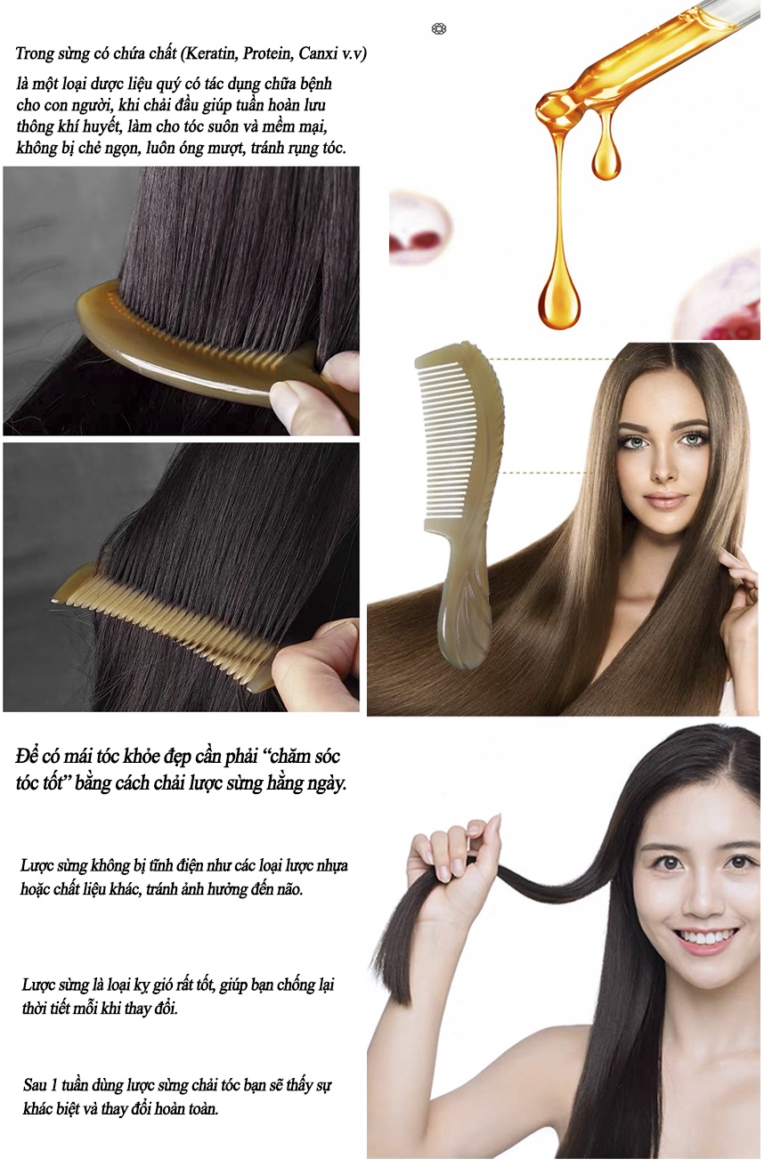 ✔ Trong sừng có chứa chất (Keratin, Protein, Canxi v.v) là một loại dược liệu quý có tác dụng chữa bệnh cho con người, khi chải đầu giúp tuần hoàn lưu thông khí huyết, làm cho tóc suôn và mềm mại, không bị chẻ ngọn, luôn óng mượt, tránh rụng tóc.